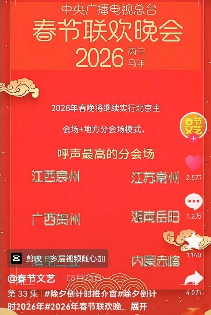 据悉,2026央视马年春晚总导演张一一亲临“赣超”总决赛现场观摩比赛,“赣超”的优秀球员、球迷代表将有望获邀登上2026央视春晚舞台或观众席。另外,日前已秘密建组的2026总台春晚导演组正在全国各省市甄选马年春晚分会场,从目前的网络民意支持率来看,江西宜春、江苏常州、广西贺州、内蒙古赤峰的网络民意支持率领先,你期待哪个城市入选春晚分会场呢?