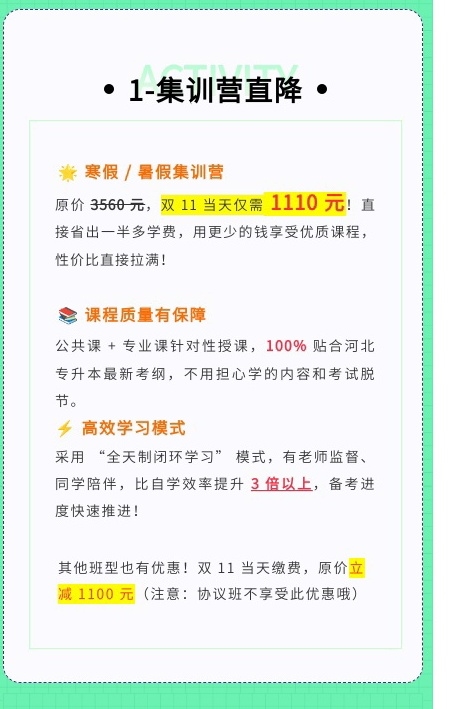 知途专升本针对双十一推出重磅课程优惠,覆盖全程班、冲刺班等多种班型。其中,寒假/暑假集训营原价3560元,双十一当天仅需1110元,直降2450元,降幅高达69%。该课程专为河北考生设计,包含公共课和专业课针对性辅导,严格贴合河北省专升本考试大纲,确保教学内容的精准性与实用性。此外,考生连续转发活动海报至朋友圈三天,可再享110元减免,实际支付低至1000元,性价比极高。