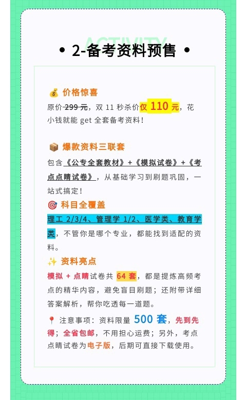 在备考资料方面,知途专升本推出爆款资料组合,包括《河北省专升本考试模拟试卷》《河北省专升本考试押题点睛试卷》及《河北省公共课+专业课全套教材》三联套。原价299元的资料套装,双十一秒杀价仅110元,限量500套,并覆盖河北全省包邮。该组合紧扣河北考情,帮助考生强化实战能力,抢占备考先机。