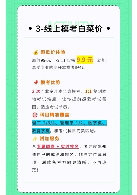 为帮助考生检验学习成果,知途专升本推出“万人模考+阅卷+排名”服务。两次全真模考完全模拟河北专升本考试难度,原价99元,双十一特惠价9.9元。考生可通过模考熟悉考试流程,查漏补缺,并通过专业阅卷和全省排名明确自身定位,针对性调整复习策略。