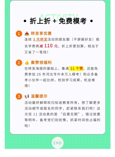 为扩大活动影响力并惠及更多考生,知途专升本设置丰富的互动福利。预热期间,考生关注官方公众号或加入河北专升本备考群,即可免费领取《河北专升本考试大纲解读》和《公共课高频考点汇总》电子资料。同时,转发活动海报至朋友圈(不屏蔽)并集满28个赞,可免费参加2026年河北省专升本万人模考。这些互动环节设计简单,参与门槛低,有效增强了用户粘性与品牌传播。【知途老师:17736003762】