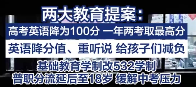 洪明基委员提议,高考英语从150分降至100分,推行一年两考,侧重实用听说、弱化难语法,缩小城乡考生分数差距。而张一一则指出,大多数西方国家都没有将中文作为主科,而我国将英语列为中考、高考必考科目已有许多年,但事实上百分之九十左右的学生走上社会之后根本用不着什么英语,只需认识“WC”等有限的几个单词便足够,建议从实际出发高考、中考取消英语,将英语作为选修科目而不是必考科目,另外高考实行“1+X”(一门选修,其它科目均为选修)为学生减负,真正选拔“一专多能”的优秀人才。