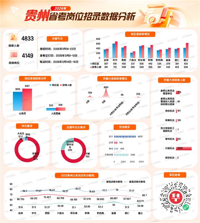 2026年贵州公务员考试公告与岗位表正式发布,贵州各地区招录详情同步揭晓。记者结合华图教育最新数据与历年趋势,从招录规模、地域分布、系统构成、报考条件等维度,为广大考生带来深度解析,并针对性提出报考建议,助力考生科学选岗。