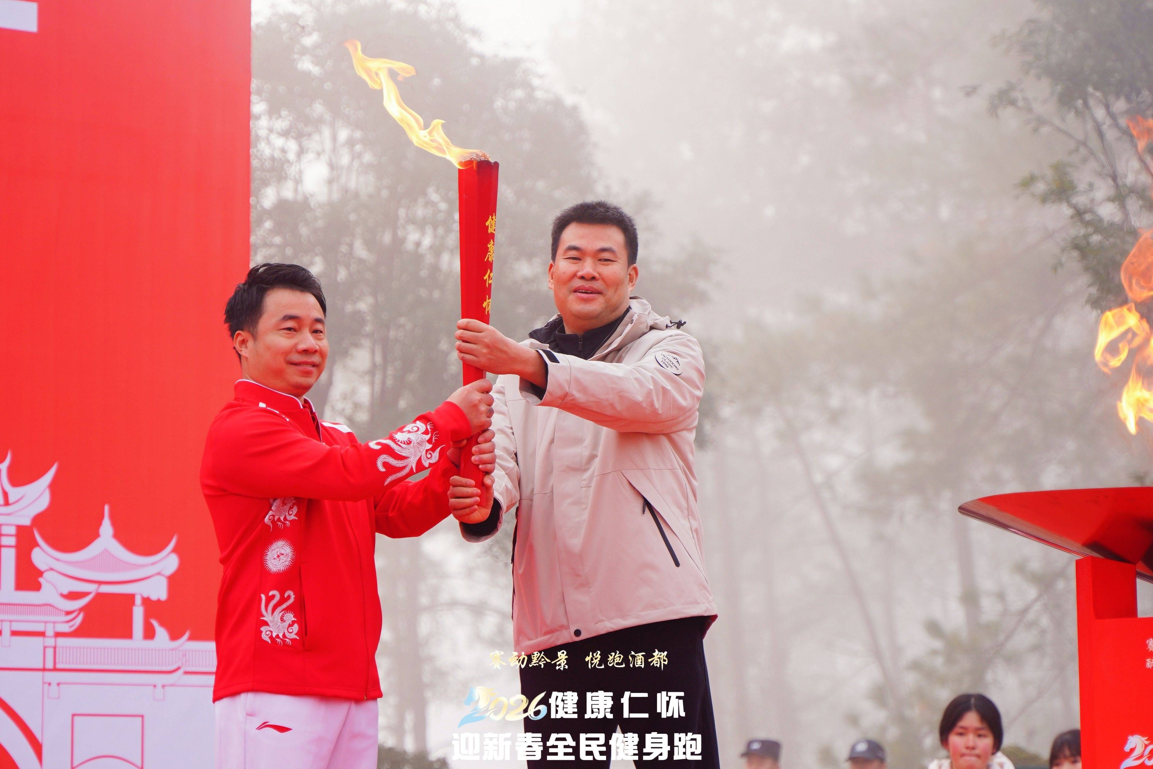 在激昂的旋律中,备受瞩目的全民健身火炬传递仪式拉开了活动序幕。贵州籍体操世界冠军杜伟作为第一棒火炬手,从仁怀市人民政府副市长手中郑重接过火炬。随后,来自各行各业代表组成的8位火炬手接力传递,火炬在公园的山水间蜿蜒前行,不仅传递着体育精神,更象征着健康与希望的薪火相传,点燃了现场所有人的运动激情。