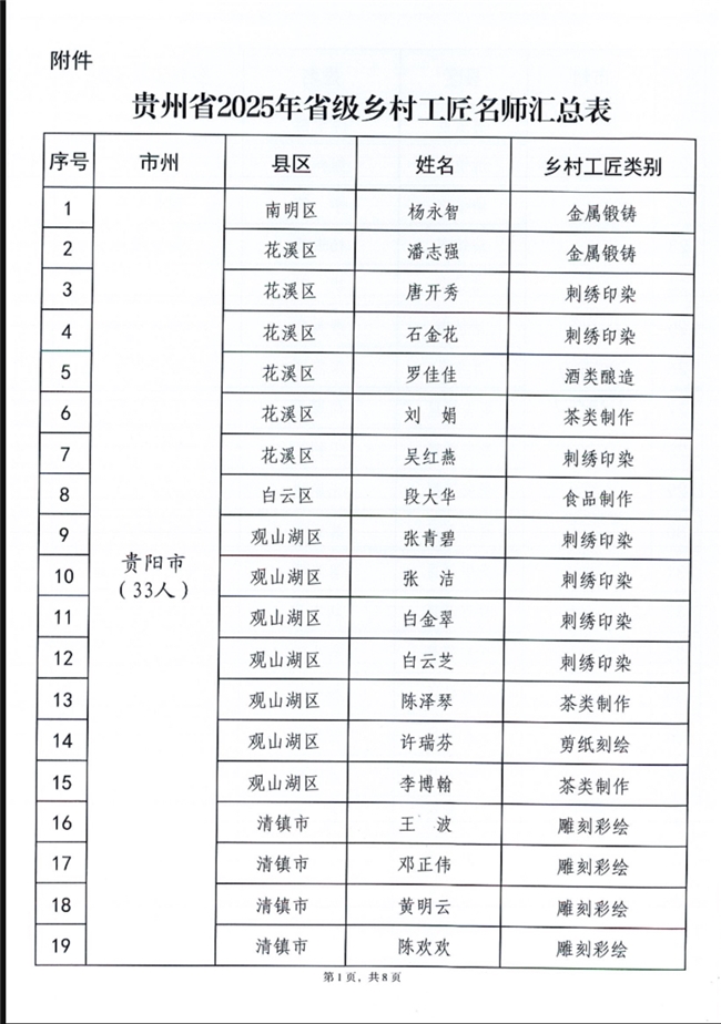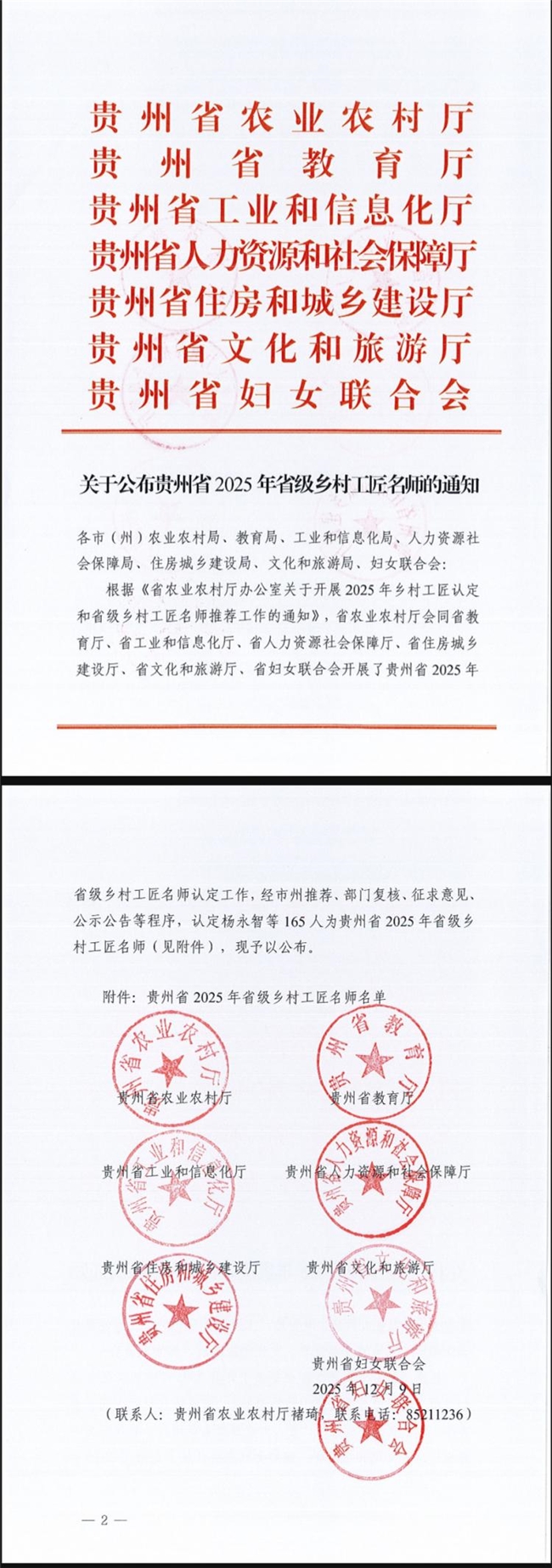 2025年12月9日,贵州省农业农村厅、贵州省教育厅、贵州省工业和信息化厅、贵州省人力资源和社会保障厅、贵州省住房城乡建设厅、贵州省文化和旅游厅、贵州省妇女联合会等多部门联合发布通知,正式公布了2025年省级乡村工匠名师认定名单。经严格程序认定,段大华凭借其在食品制作领域的精湛技艺与突出贡献,成功获评为贵州省2025年省级乡村工匠名师。