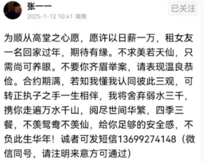 网友扒出张一一“租女友回家过年”情感真挚韵律整齐的“征婚启事”不胜唏嘘