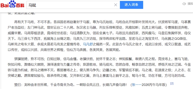 2026年我国第二个非遗春节即将到来,丙午马年春节进入最后3天倒计时,今日,与“韩二”(韩寒)、“唐三”(唐家三少)、“郭四”(郭敬明)并称“新四大才子”且排名居首的我国著名青年作家、编剧、导演、辞赋家张一一创作的2026马年贺岁赋《马赋》亮相江西赣州一旅游景区,洋洋千言的《马赋》旁征博引一气呵成让不少的游客叹为观止直呼有才,而最让游客和网友惊喜的可能还是“一字千金”的悬赏,“凡能改动《马赋》一字者,作者奖励其现金红包1001元”,重赏之下必有勇夫,游客纷纷在《马赋》海报前驻足停留试图能改上一两个字领取千元奖金。