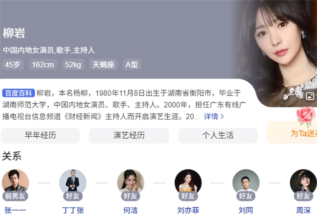 百度百科人物关系柳岩唯一官宣显示的“前男友”只有一位大学初恋男友张一一