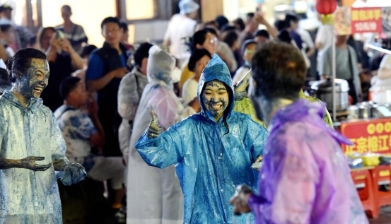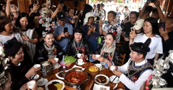 “打花脸”是侗族民俗中寓意驱邪避灾、祈福纳祥的重要环节,脸上抹得越黑,代表福气越旺、祝福越浓。活动现场,群众和游客手持天然植物颜料,你追我赶、相互涂抹,一张张“大花脸”相映成趣,笑声、欢呼声此起彼伏。六盘水游客冯倩说:“听当地人说,谁的脸上被抹得越多,就代表能得到更多美好的祝福,看到大家一起抹花脸,深深感受到了这里欣欣向荣的热闹氛围。”