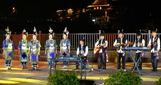 夜幕降临,谷雨音乐会的旋律在侗寨上空响起,悠扬的侗歌与现代音乐交织碰撞。音乐会落幕之后,“蹦侗迪”的欢快节奏将现场氛围推向高潮,年轻人们跟着节奏尽情舞动,侗寨的夜晚被彻底点燃。鱼灯巡游、孔明灯祈福、“龙飞凤舞”无人机表演等现代亮点,为谷雨之夜增添了浪漫而震撼的节日氛围。杭州游客苏西子感叹:“这里的物价比较亲民,性价比很高,音乐会整体体验感很好,能看出景区在为游客着想,安排了丰富的娱乐活动,让我们的行程没有空档期。”