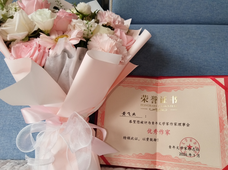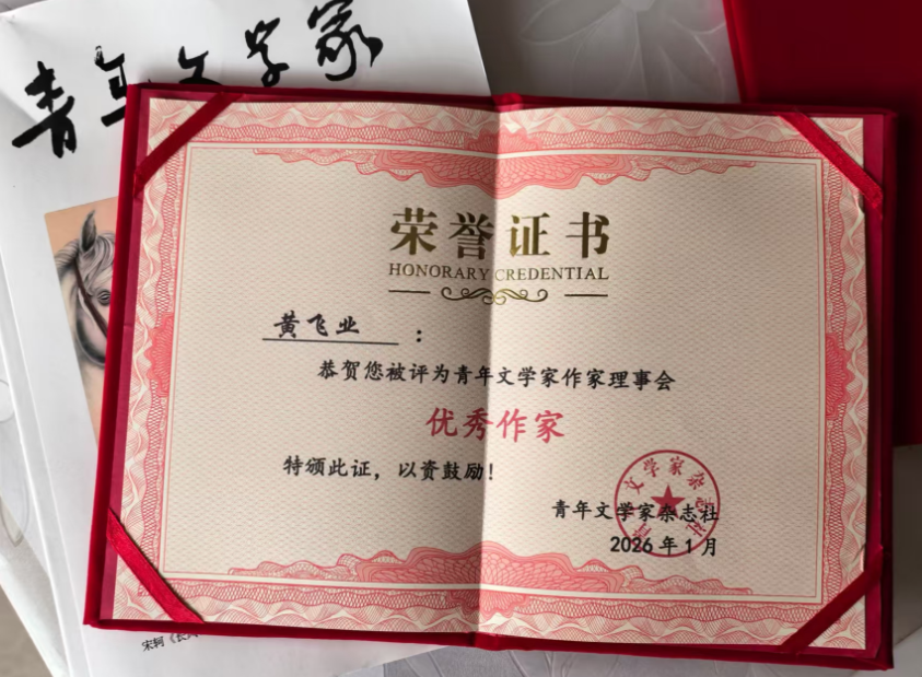 2026年1月伊始,中国梦吉祥物国家知识产权艺术品创始人黄飞业先生被《青年文学家》杂志社授予“优秀作家”。