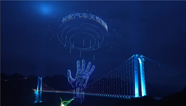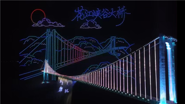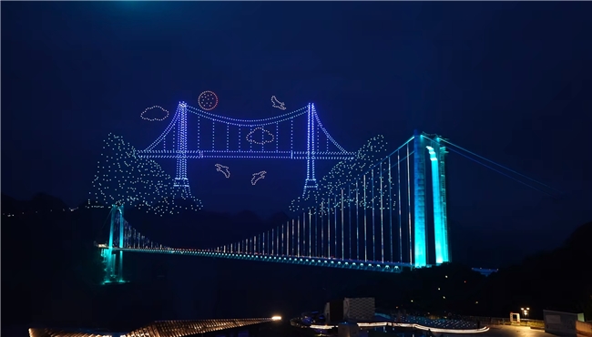 当日晚间,2045架无人机腾空而起,正式拉开光影盛典。第一场主题“超级工程铸通途”以夜空为幕、光影为笔,立体勾勒大桥雄奇桥型与精湛结构,全景呈现贵州超级工程的工程美学与科技之光;第二场主题“山水人文融画卷”铺展峡谷山水、民族风情与乡村振兴盛景,诉说大桥赋能地方就业、激活文旅消费的温情故事。同步上演的水幕灯光秀将民族纹样与桥梁雄姿投射于水雾之间,现场欢呼声此起彼伏。
