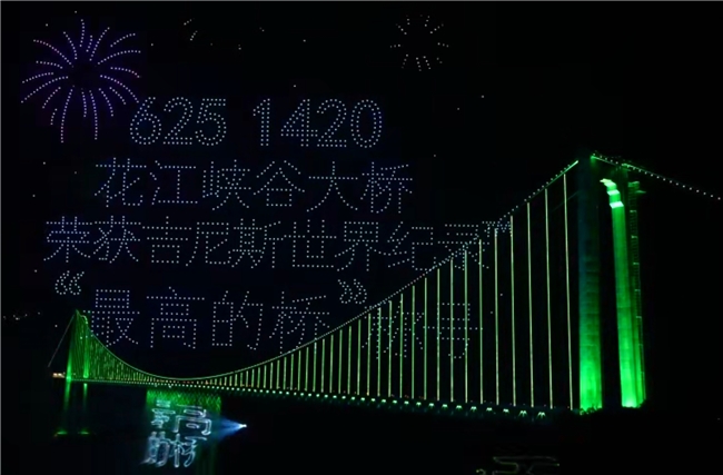 贵州网讯:4月28日,由长安天枢智能独家冠名的“贵州花江峡谷大桥世界纪录最高的桥认证仪式”在贵州省贞丰县云渡服务区隆重举行。经权威机构现场认证,大桥以桥面距水面625米的垂直高度,正式摘得“世界第一高桥”桂冠。当晚,2045架无人机携大型水幕灯光秀点亮峡谷夜空,数以万计游客汇聚于此,共同见证中国基建与汽车工业联袂呈现的世界级时刻。