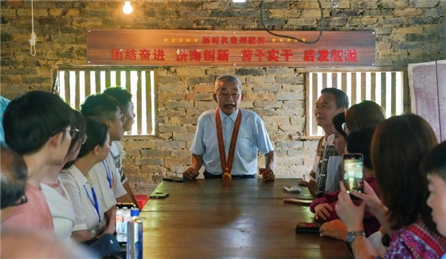 研学团队在播州区平正仡佬族乡听取老支书黄大发讲述修建大发渠故事